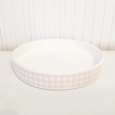 1 Bandeja de cerâmica redonda branca com estampa xadrez / vichy rosa rosé - diâmetro 23,5cm x 4cm alt.