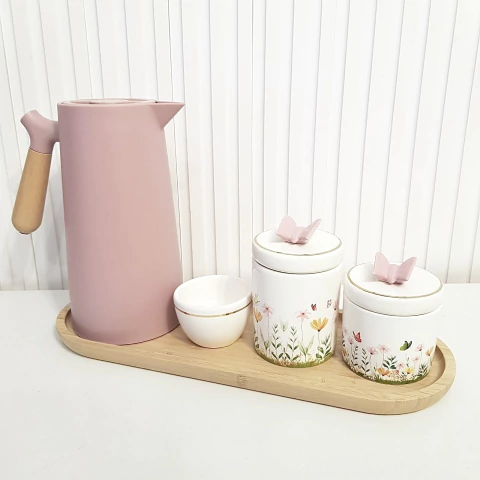 1 Porta-cotonete de cerâmica estampa Jardim Encantado com tampa branca com filete dourado e aplique de borboleta rosa bebê