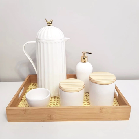1 Porta-cotonete de cerâmica branco e tampa madeira pinus