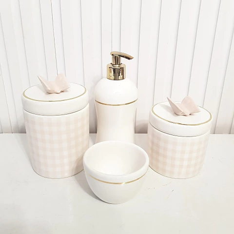1 Porta-cotonete de cerâmica branco com estampa xadrez rosa e tampa branca com filete dourado e aplique de borboleta rosé