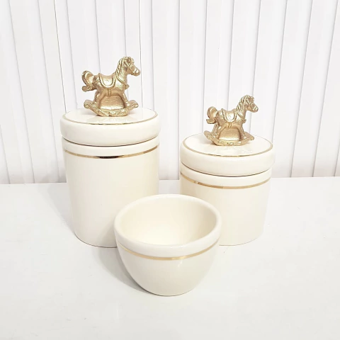 1 Porta-cotonete de cerâmica creme com filete dourado e tampa de cerâmica ou madeira pinus com aplique de cavalinho dourado