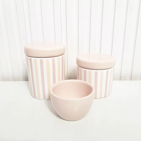 1 Porta-algodão de cerâmica estampa listras rosas e tampa rosé