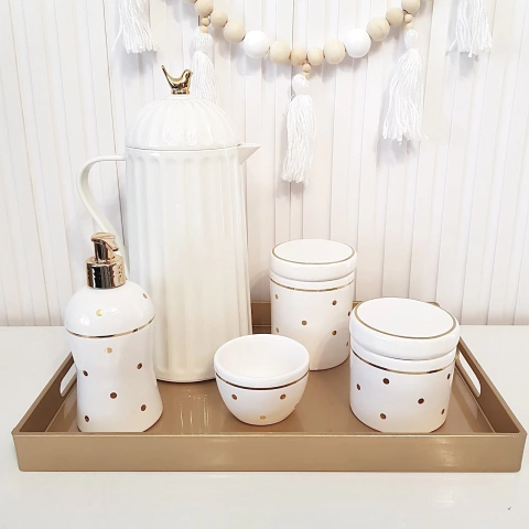1 Porta álcool gel de cerâmica branco com poás e filete dourado, e com válvula dourada